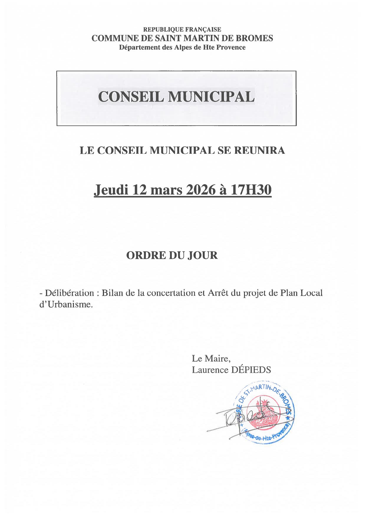 12 mars 2026; 17h30 : Conseil municipal