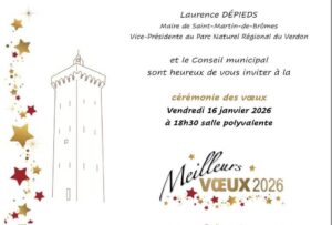 Laurence Dépieds, Maire de Saint-Martin-de-Brômes, Vice-Présidente du Parc Naturel Régional du Verdon; entourée des membres du conseil municipal, aura le plaisir de vous présenter ses vœux pour 2026, le vendredi 16 janvier 2026, à 18h30, dans la salle polyvalente.