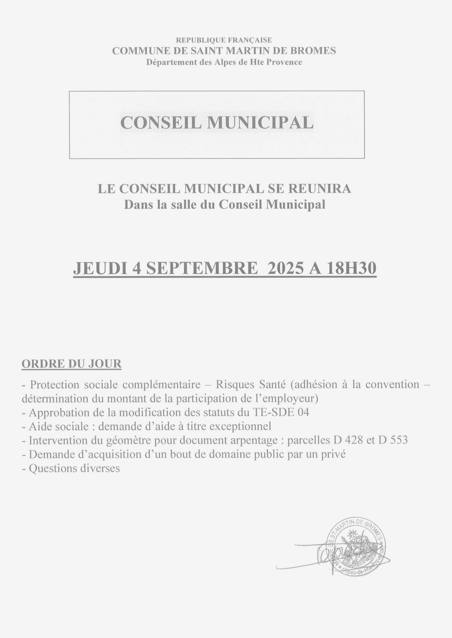 4 septembre 2025, 18h30 : Conseil municipal