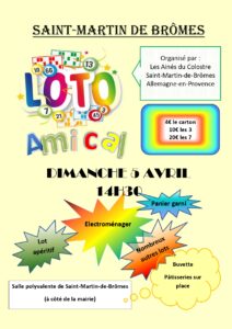 5 avril 2026, 14h30; loto amical des Aînés du Colostre
