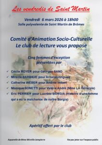 Une nouvelle soirée du CASC consacrée à la journée de la femme. Dans le cadre des « vendredis de Saint Martin » le 6 mars à 18h dans la salle des fêtes de Saint Martin, le club de lecture propose de rendre hommage à 5 femmes d’exceptions au travers de leur vie. Nul doute que ce sera une excellente soirée terminée comme ils ont l’habitude de le faire par le verre de l’amitié offert par le club.