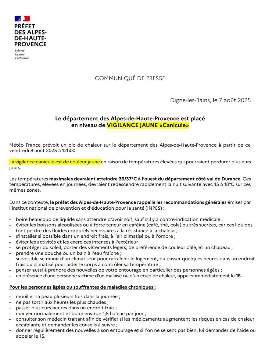 Le préfet a déclenché l’alerte canicule jaune avec un pic à 12h00 et des températures de 36 à 37°.