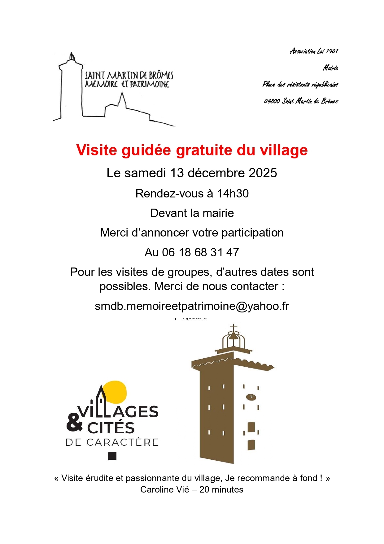Samedi 13 décembre, 14h30; visite guidée gratuite du village. RDV devant la mairie