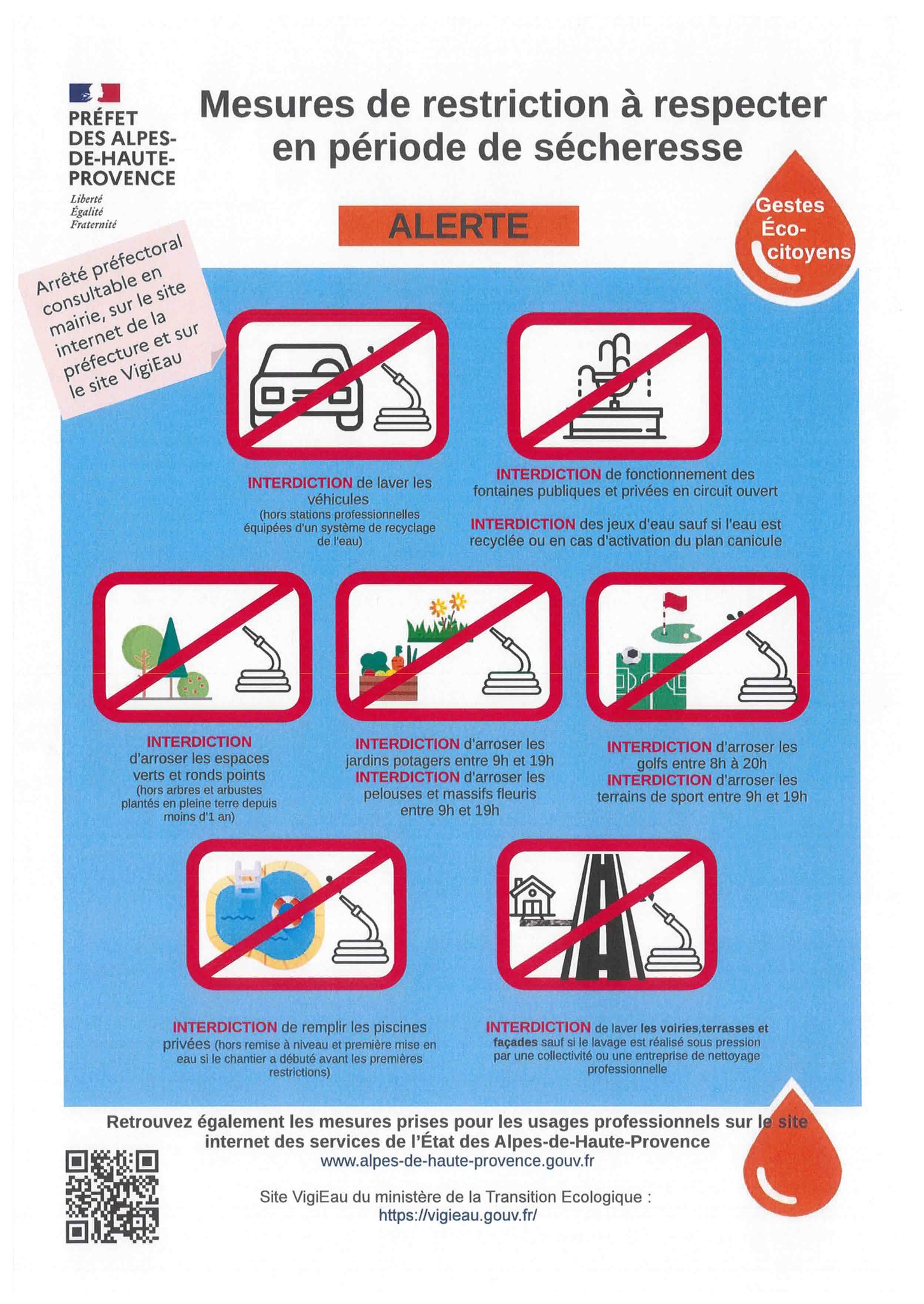 L’ensemble des dispositions applicables est consultable dans toutes les mairies, sur le site des services de l’État à la rubrique actualité/sécheresse et à la Direction départementale des territoires des Alpes-de-Haute-Provence.