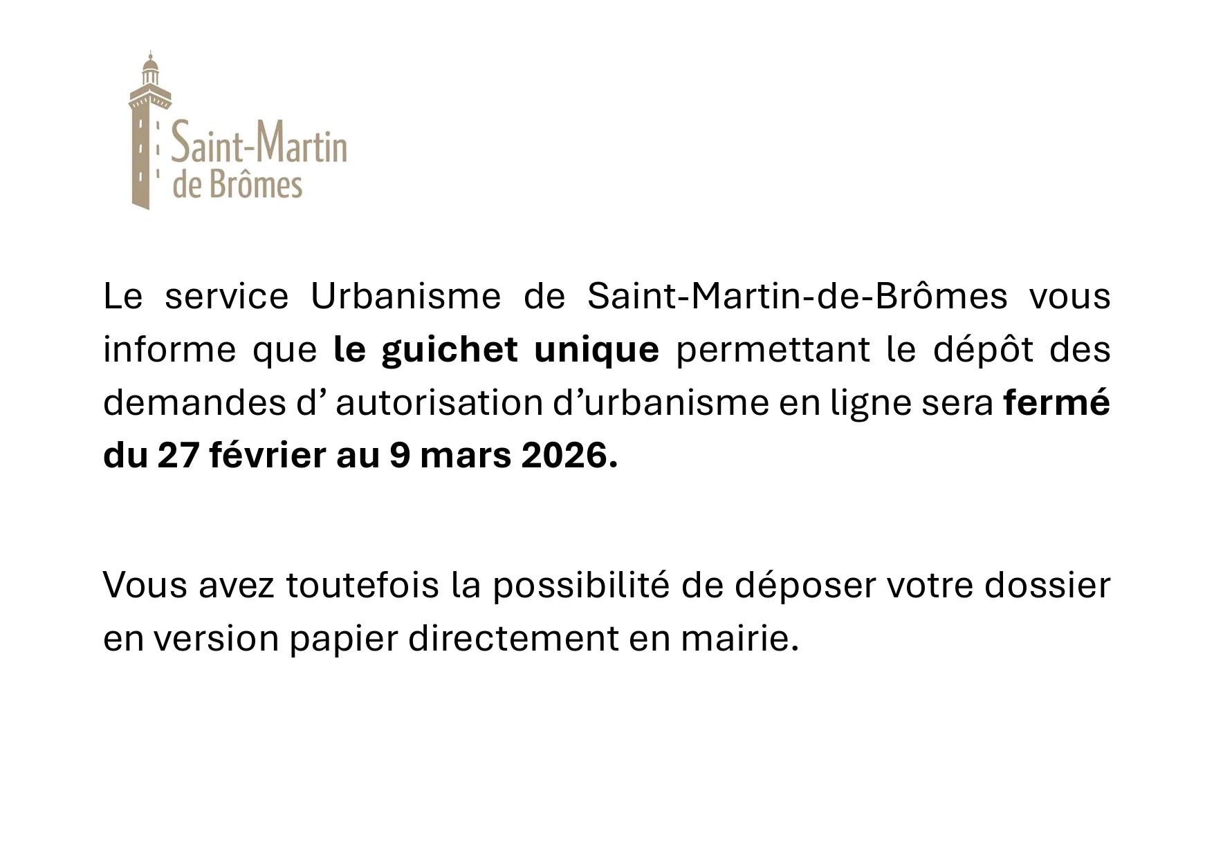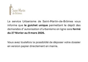 Le guichet unique pour le dépôt des dossiers d’urbanisme sera provisoirement fermé du 27 février au 9 mars 2026. Les dossiers papier peuvent être déposés en mairie